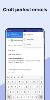 Connect for Hotmail & Outlook muudab sinu e-kirjade haldamise intuitiivseks ja tõhusaks. Kohanda oma postkasti ja kaustade vaateid, kategoriseeri kirju fookuse, muu või kõigi kirjade vaatesse ning naudi vestluste grupeerimist lihtsamaks jälgimiseks. Täpsem otsing laseb sul filtreerida e-kirju saatja, teema, manuse või kausta järgi, muutes vajaliku info leidmise hetkeliseks. Lisaks pakub rakendus tugevat kaitset parooli ja sõrmejälje abil ning mugavat päeva- ja öörežiimi, et tagada privaatsus ja silmade mugavus igas valgustingimuses. Ka PDF-printimise võimalus on olemas, pakkudes täielikku kontrolli sinu dokumentide üle.