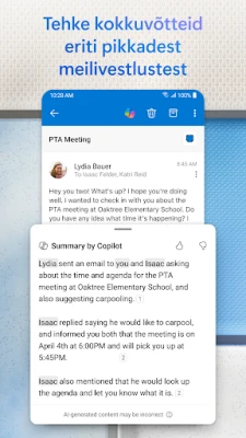 Lisaks e-kirjade efektiivsele haldamisele ühendab Outlook Androidi jaoks sinu suhtluse ja ajaplaneerimise üheks harmooniliseks tervikuks. Vaid paari puudutusega saad mugavalt liikuda meilisõnumite ja kalendri vahel, planeerida kiirelt koosolekuid või jagada oma vabu aegu kolleegidega. Enam ei ole vaja rakenduste vahel edasi-tagasi hüpata, kui soovid e-kirjale faili lisada – kõik vajalikud dokumendid on hõlpsasti ligipääsetavad otse rakendusest. Olgu tegemist olulise aruande või meeldejääva pildiga, Microsofti poolt loodud Outlook Androidi jaoks teeb failide jagamise imelihtsaks.