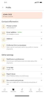 Omniva disainimisel on keskendutud kasutajakogemusele, luues puhta ja intuitiivse liidese, mis teeb navigeerimise imelihtsaks. Iga funktsioon on käeulatuses, et säästa teie aega ja pakkuda sujuvat interaktsiooni. Et hoida teid pidevalt kursis, edastab Omniva automaatselt värskeimad teavitused teie saadetiste oleku kohta otse teie seadmesse. Teie tagasiside on meile aga hindamatu väärtusega – aidake meil kasvada ja pakkuda veelgi paremaid teenuseid. Täname, et olete valinud Omniva!