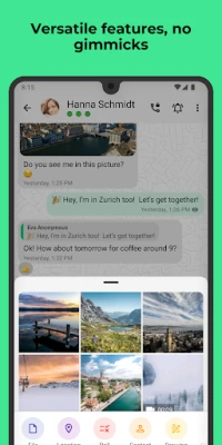Threema pakub laia valikut suhtlusvõimalusi. Lisaks krüpteeritud tekstisõnumitele, häälsõnumitele ja emodži-reaktsioonidele on võimalik teha täielikult krüpteeritud kõnesid ja videokõnesid nii individuaalselt kui ka gruppides. Jagage asukohta, saatke faile mis tahes formaadis – olgu selleks PDF-dokumendid, GIF-id, MP3-failid või ZIP-arhiivid – teades, et kõik on kaitstud. Lisaks annab Threema teile kontrolli: saate saadetud sõnumeid muuta või vestluspartnerite jaoks kustutada. Grupivestluste loomine ja küsitluste korraldamine on lihtne ning Threema mugavust laiendavad ka lauaarvuti rakendus ja veebiklient, pakkudes privaatset suhtlust igas seadmes.