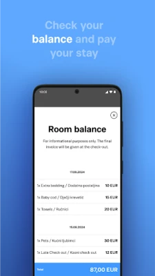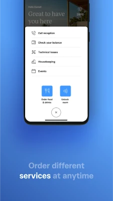 Jätke hüvasti pikkade järjekordadega ja nautige kiiret sisseregistreerimist otse oma seadmest. Unustage füüsilised võtmed – teie telefonist saab mugavalt toa digitaalne võti, pakkudes kaasaegset ja turvalist ligipääsu.* Lisaks pakub rakendus lihtsat võimalust tellida toateenindust või majapidamisteenuseid, tagades, et teie soovidele vastatakse kiirelt ja efektiivselt, pakkudes teile täielikku mugavust ja muretut viibimist.
