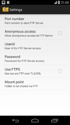 wififtpserver pakub laia valikut kohandatavaid funktsioone, mis tagavad just teie vajadustele vastava serverikeskkonna. Saate seadistada oma serveri pordinumbri (vaikimisi 2221) ning määrata kasutajanime ja parooli turvaliseks ligipääsuks. Lisaks standardsele FTP-le toetab rakendus ka turvalisemat FTPS-protokolli (FTP üle TLS/SSL), pakkudes täiendavat kaitsekihti teie andmetele. Konfigureerige kergesti kodukausta asukoht, sealhulgas väline SD-kaart Android 5.0 ja uuematel seadmetel, ning kontrollige anonüümset juurdepääsu vastavalt oma eelistustele.